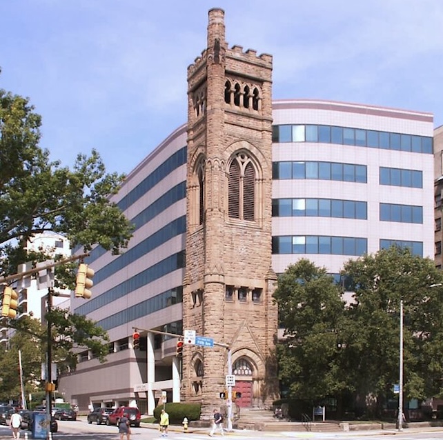 这是匹兹堡的一栋建筑,人们把教堂拆除了,却保留了尖塔,又紧挨着后面修了一栋楼,这画风