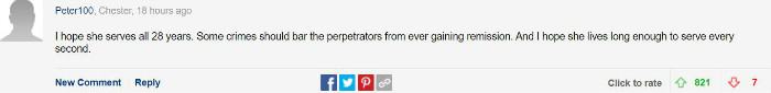 希望她能至少被关够28年。有些罪名就应该禁止罪犯获得假释。