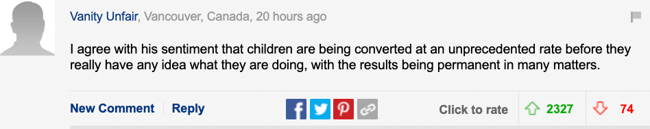 他认为专门设置“跨性别者”一类的代名词,其实并不是在帮助这群人,相反,这会使他们的心理健康更加恶化。