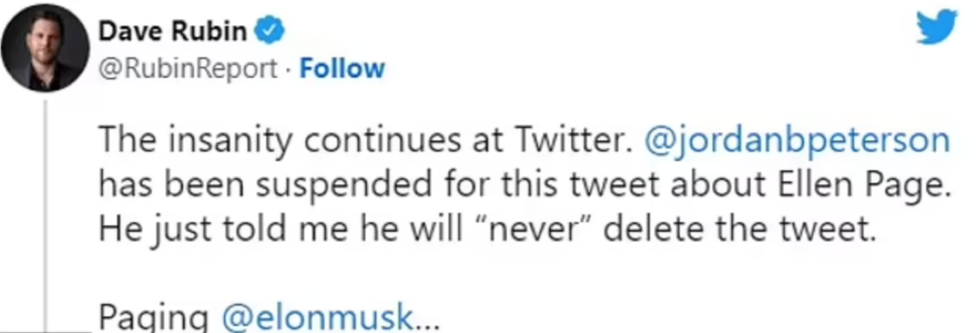 这已经是彼得森第二次被推特禁言了,这位语不惊人誓不休的博士之前也说过不少颇有争议性的言论。