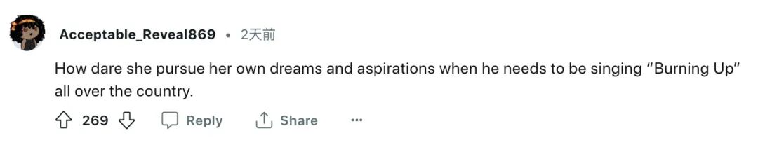 “当他需要在全国各地演唱《Burning Up》时,她怎么敢去追求自己的梦想和抱负。”