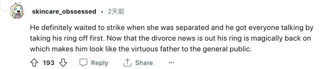 “在她离开家(去英国工作)时,他肯定会主动发起进攻的,而且是他先摘下婚戒,让大家议论纷纷的…现在离婚消息传出之后,他的戒指又神奇地被戴上,这让他在所有人眼里像是一位贤惠顾家的好父亲呢。”