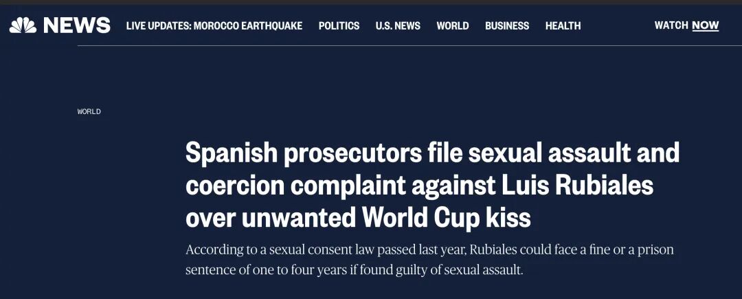 根据西班牙新法案的内容——消除“性骚扰”和“性侵犯”之间的区别,制裁任何未经同意的性行为,意味着如果性侵犯罪名成立,卢比亚莱斯可能面临罚款或是1到4年的监禁…