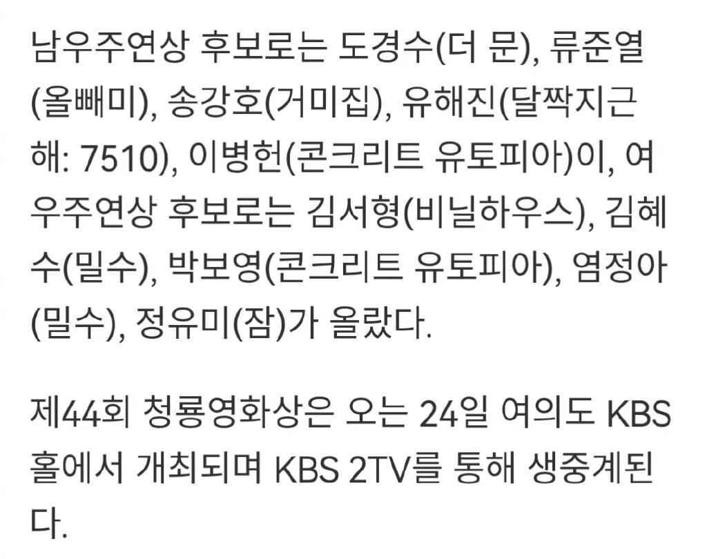 奖目前还没颁,但如果还是柳俊烈,那他就是这一届的百想青龙双影帝,只要不违法犯罪,未来相当可期…