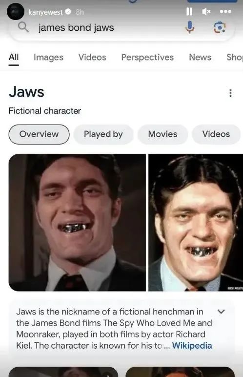 根据他的ins动态,新牙齿造型的灵感来源是007里的反派角色Jaws…