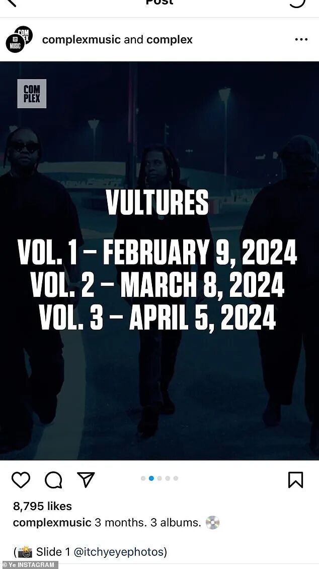 新专辑《Vultures》分为三版,分别在2月9日、3月8日、4月5日发布…