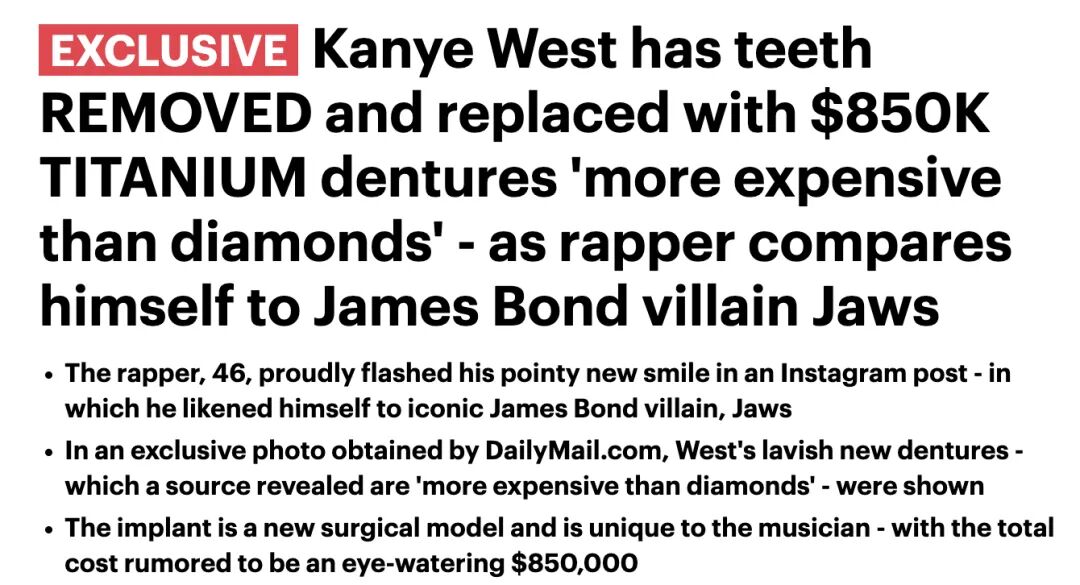 先是侃爷灵感乍现,在创作出“钻石牙”、“巴黎世家”牙之后,给自己换了一口钛合金牙…