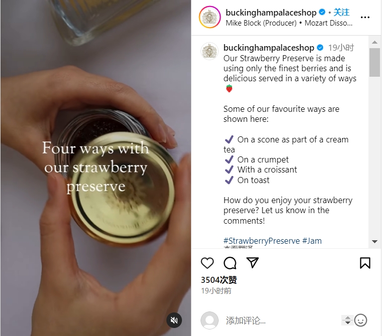 白金汉宫官方商店给他们的草莓果酱也拍了一条广告,昨天发布在他们的Ins上。