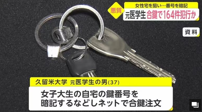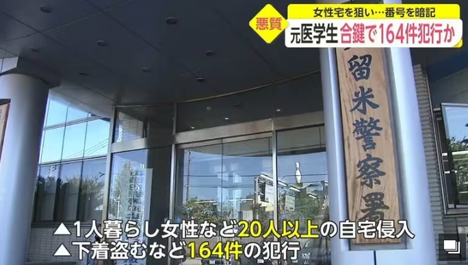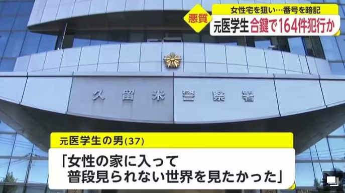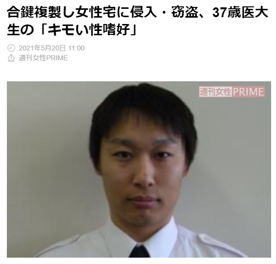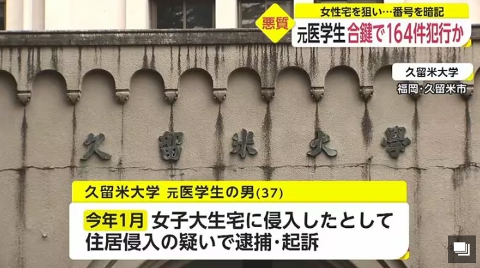 2021年5月,日本福冈县久留米大学医学部的一位37岁男生阪上翔伍,因为私闯民宅实施盗窃被警方逮捕。
