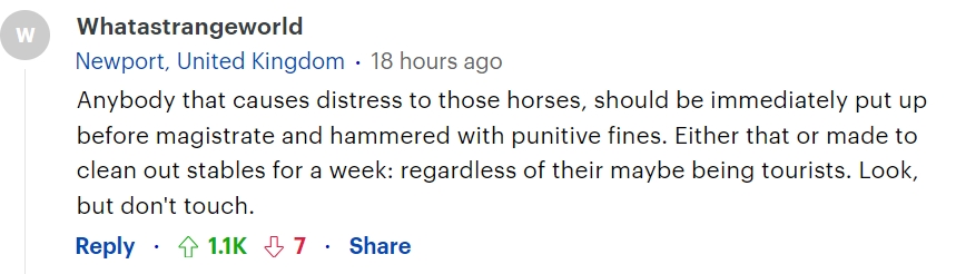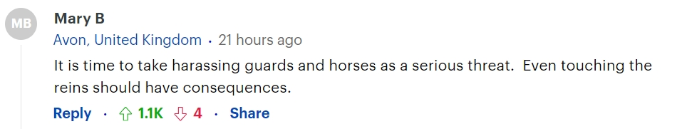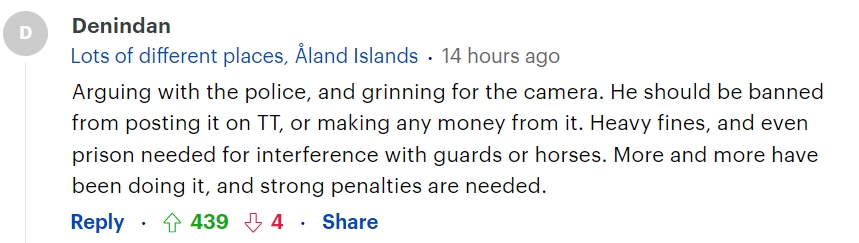 “跟警察吵架,对着镜头笑。他应该被禁止在TT上发这条视频,或者从中获利。干扰警卫或马匹应该被处以大额罚款,甚至入狱。越来越多人正在这么做,这就需要严厉的惩罚。”