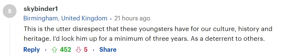 “这就是年轻人对我们的文化、历史和遗产的不尊重。我会把他关起来至少三年。作为对其他人的警告。”