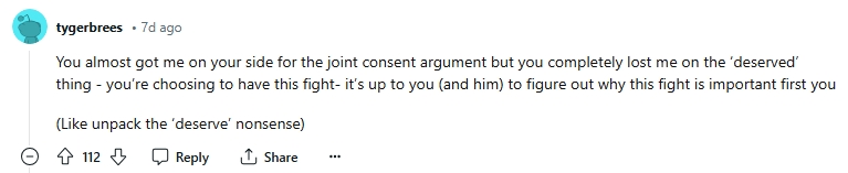 “在你说‘夫妻双方需要一起同意’时我还站在你这边,但你说你‘应得’这枚戒指,让我不理解了。”