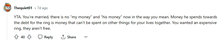 最近又有一位女士来这里发帖吐槽,引起了网友们的争议。故事的叫:《我要求丈夫将我的订婚戒指退掉,因为他用我们的共同账户付款,我是个混蛋吗?》