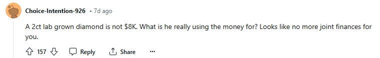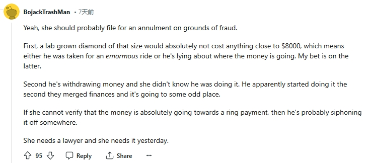 首先,这个尺寸的人工钻戒肯定不会贵到8000美元,这意味着丈夫要么被骗了,要么在钱的方面撒谎了。我打赌是后者。