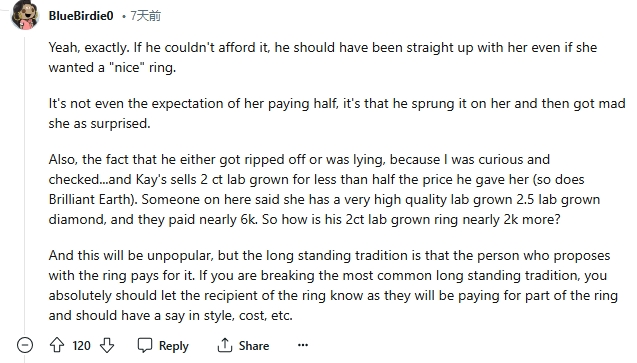 我查了一下人工钻戒,基本还不到他报价的一半呢。评论里有人说,她有一颗品相很好的2.5克拉人工钻戒,也只花了6000美元,那这枚2克拉的为什么会贵了2000美元呢?