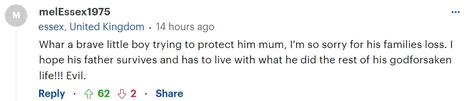“多么勇敢的小男孩,他试图保护他的妈妈,我对他的家人的损失深感遗憾。我希望他的爸爸能活下来,并在悲催的余生中承受他的所作所为(带来的折磨)!!!这个恶魔。”