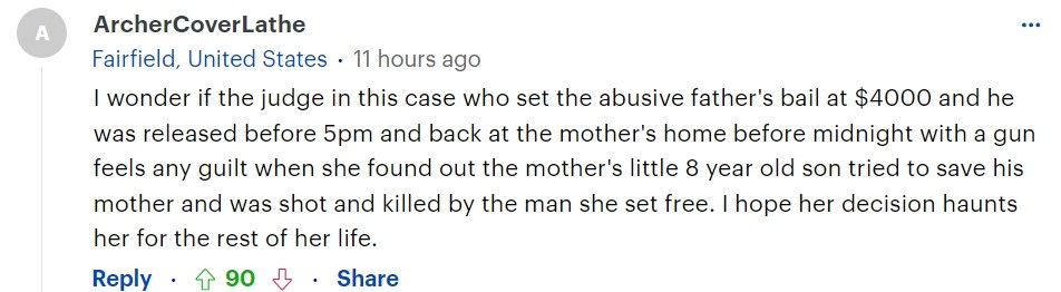 “这起案件的法官把家暴爸爸的保释金定为4000美元,并在下午5点前把他释放,让他在午夜之前带着枪回到妈妈家里,当她看到妈妈8岁的小儿子试图救母并被她释放的男人开枪打死时,我不知道她是否会觉得内疚。我希望她的决定会困扰她一生。”