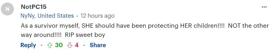 “作为一名(家暴)幸存者,她应该保护她的孩子!!!!而不是反过来!!!!安息吧,可爱的男孩。”