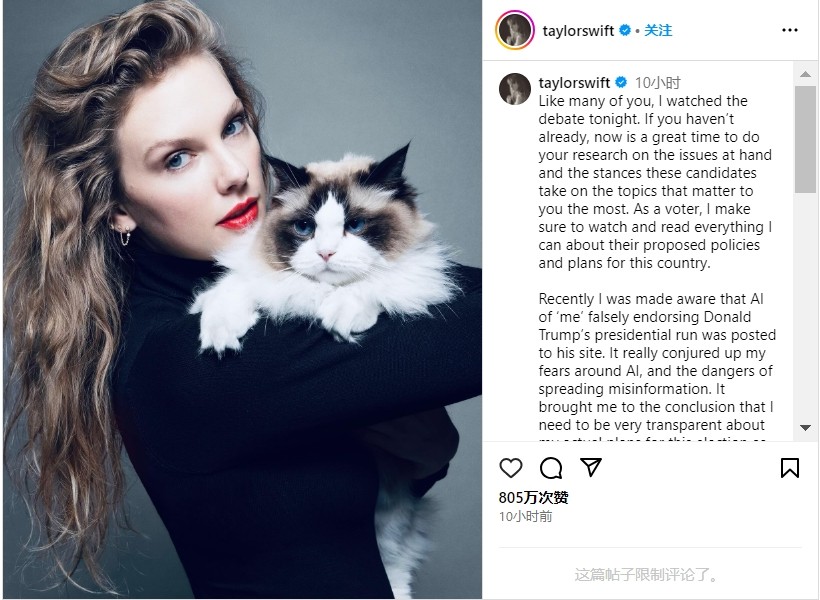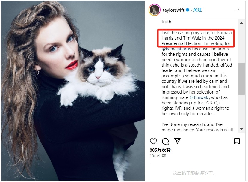 在辩论结束后没多久,“霉霉”泰勒·斯威夫特就在Instagram上发了一篇小作文。