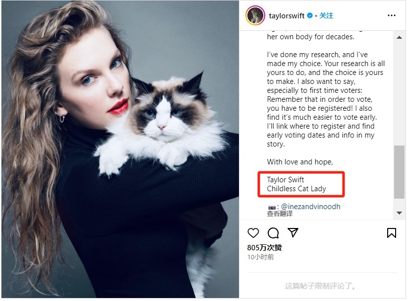 落款的位置,霉霉在签名时写了“没孩子的养猫女子”,配图也是跟猫咪的合影。
