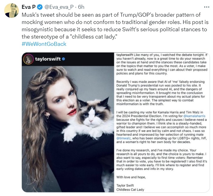 “马斯克的帖子应该被当做,特朗普/共和党嘲笑不符合传统性别角色的女性的模式的一部分。他的帖子是在厌女,因为它试图将斯威夫特的严肃政治立场,贬低为‘无子女养猫女’的刻板印象。”