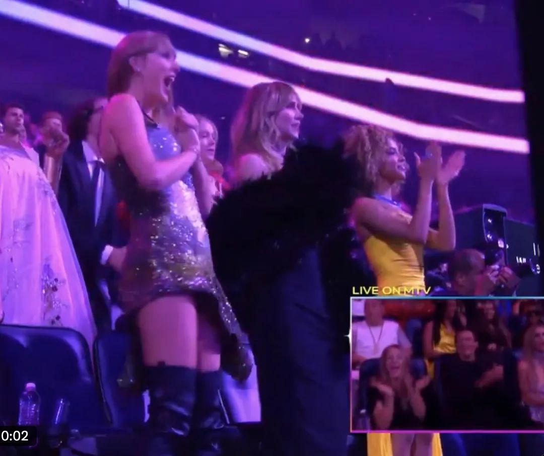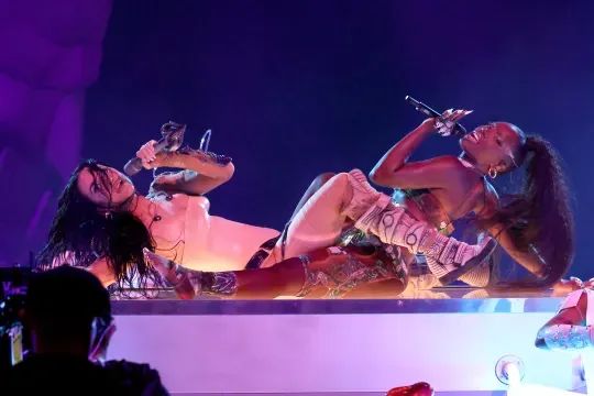 在和另一位女说唱歌手Doechii合唱时,水果姐和Doechii双双躺在舞台地板上,扭动身体,越靠越近,双腿亲密地交缠在一起,各种姿势来回换…