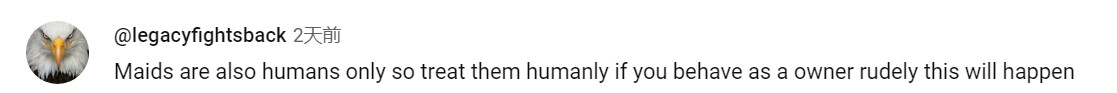 “女佣也是人,要像对待正常人一样对待她们。如果你以主人身份粗鲁行事,就会发生这种情况。”