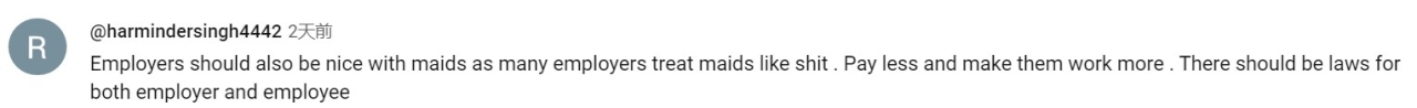 “雇主也应当善待女佣,很多雇主都不尊重女佣,克扣工资,还让她们干更多活。针对雇主和女佣双方,都应该设定法律。“
