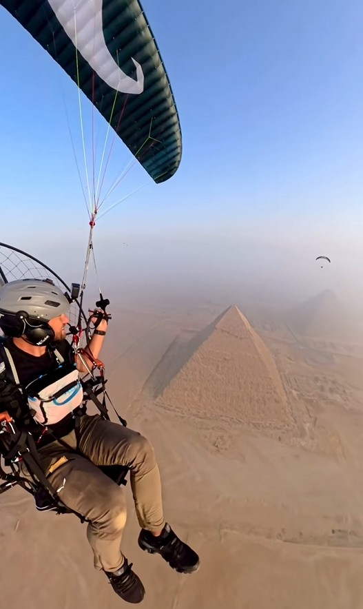 当天的参与者基本都在身上戴了运动相机,用以记录自己飞跃金字塔的瞬间,而他们拍的所有视频里最火的,无疑来自Marshall Mosher。