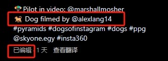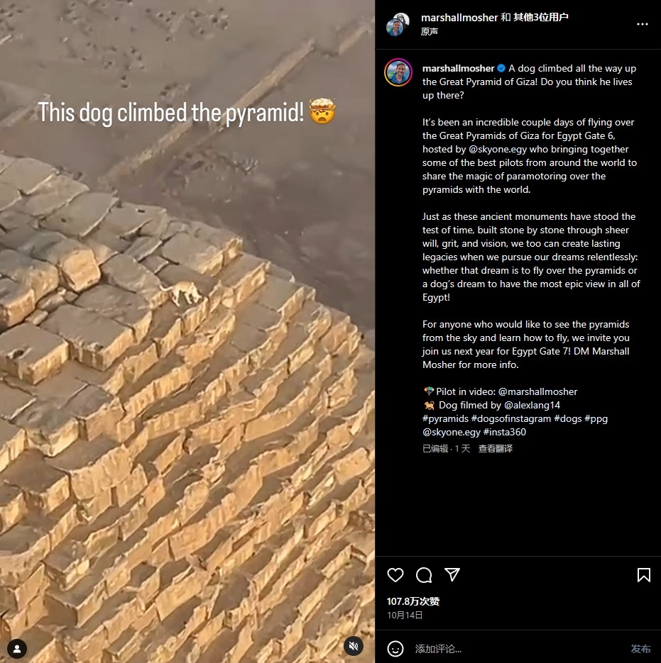 10月20号,一个叫“体验埃及”的账号也发了个视频,说拍到了狗狗从金字塔下来。经查询,这号是埃及旅游局的官号,应该还是有一定可信度的。