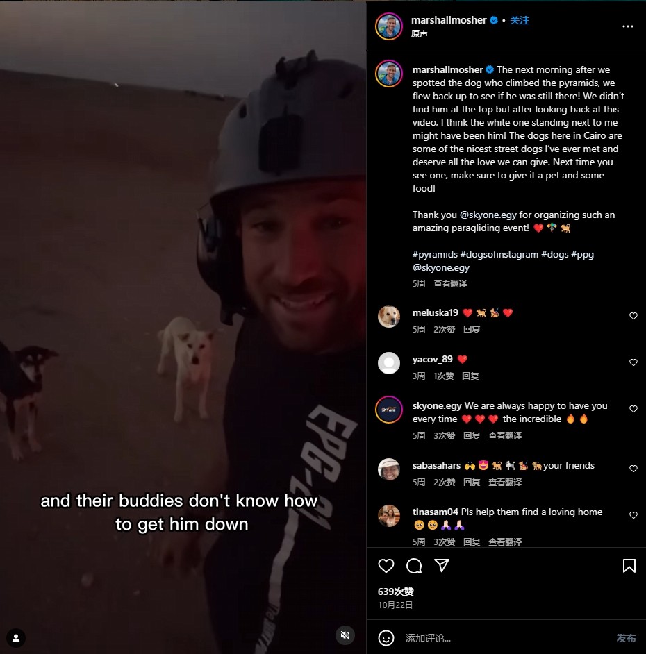 Mosher落地后又发现了一群流浪狗,他表示,在看了两段视频后,他觉得身边这条白色狗狗应该就是“困在上面”那条。
