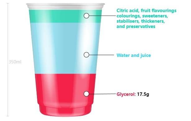 而且据英媒介绍,英国市售的这类冰沙加甘油加非常多,350ml的小杯冰沙就含有17.5g甘油。
