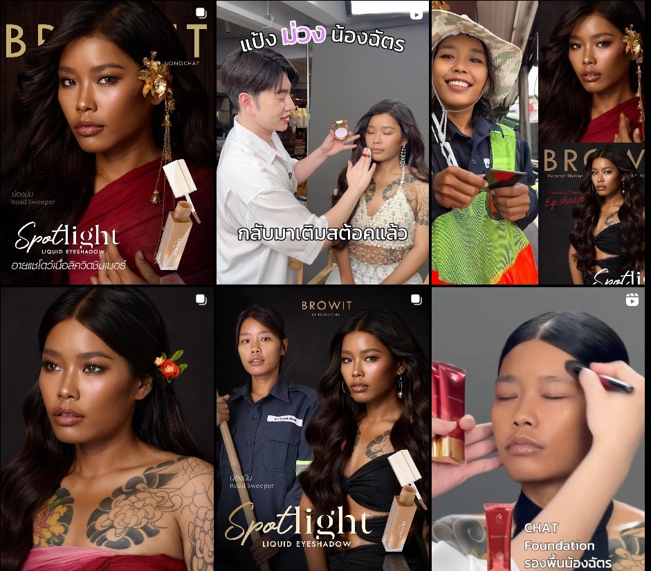 最近一段时间,Nong Chat的IG主页全是Meen帮忙拍摄的宣传照,各种粉底液、眼影,请她拍了个遍,俨然已将她当成了新宠。