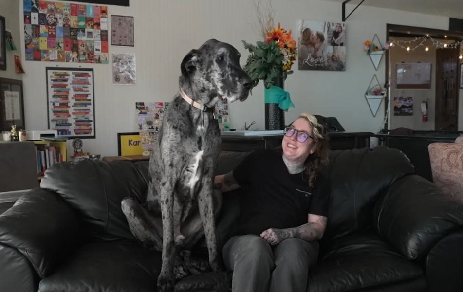 两只狗狗的身高差了将近1米,珀尔整个身子甚至没有雷吉的脑袋大,不过它们的主人依旧很放心、并且期待这次见面,丝毫不担心雷吉一不小心把珀尔吃了……