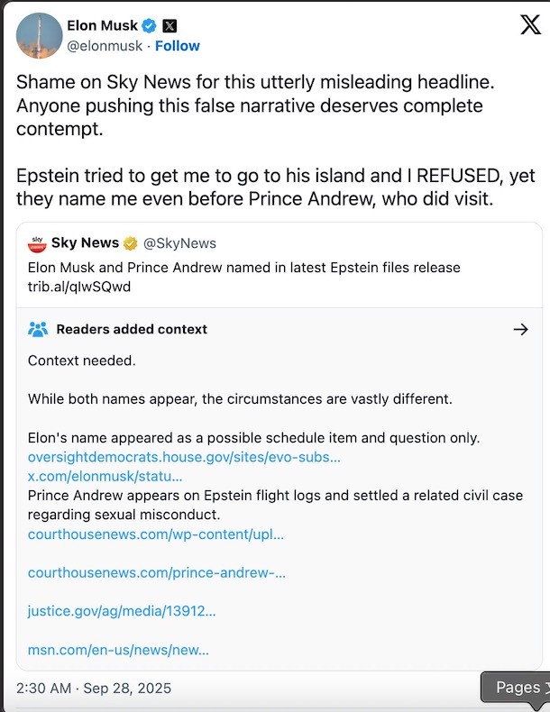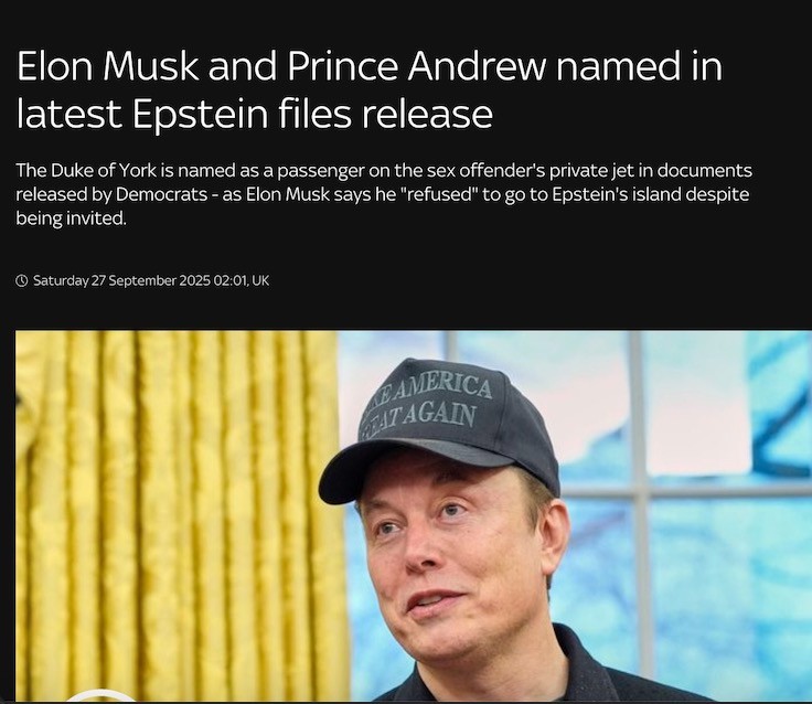 马斯克的愤怒可以理解,毕竟就在两天前,《天空新闻频道》放出的文章标题是这样的:《埃隆·马斯克和安德鲁王子的名字出现在最近公布的爱泼斯坦文件中》