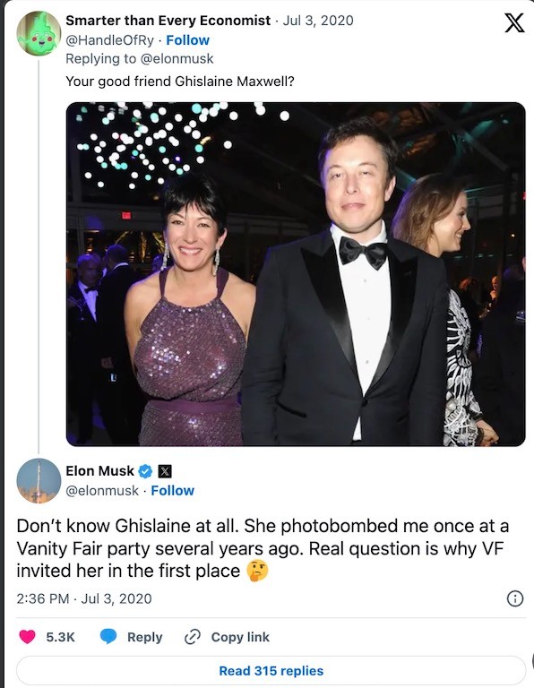 除此之外,马斯克还断然否认了他跟爱泼斯坦的同伙麦克斯韦尔是好友的说法,称自己完全不认识麦克斯韦尔。