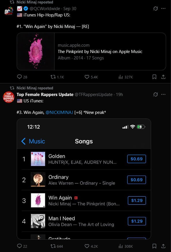 到这儿还没完,麻辣鸡随后又转发了多条粉丝发言,大意就是炫耀自己的专辑和单曲也登上了iTunes 销量榜第一。