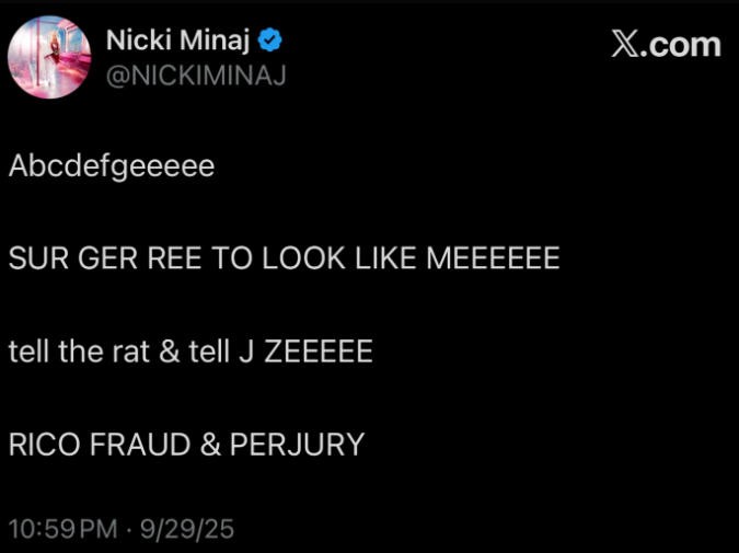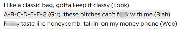 “abcdefg,做手术来抄我脸,告诉老鼠告诉JAY-Z,RICO欺诈还作伪证。”