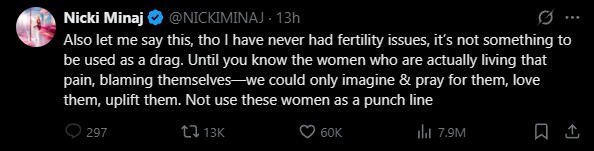 “我从来没有过不孕问题,这也不是能用来攻击的事。那些承受着不孕问题的女性生活在痛苦当中,我们只能为她们祈祷,而不是用她们来攻击。”