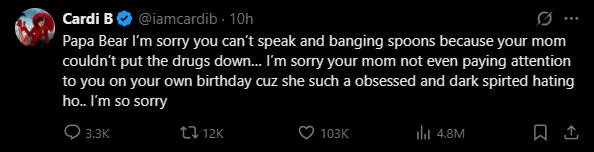 “Papa Bear,我很抱歉你不会说话还敲勺子(自闭症的刻板行为),因为你妈妈就是放不下毒品…我很抱歉即便在你生日这天,你妈妈也不在意你,因为她是个负能量满满,心理扭曲的碧池…我很抱歉。”