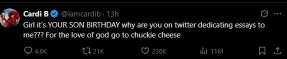 最搞的是,当天是麻辣鸡儿子的生日,卡老师实在无法理解她为什么要选在这一天开战,表示快带你儿子去快餐厅吧。