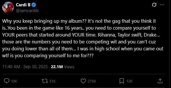 “你老提我的专辑干嘛呢?你都入行16年了,要比也是跟你同辈的去比啊,蕾哈娜,霉霉,公鸭Drake…这才是你应该去竞争的人,但你没有,因为你一个也比不过。你出道的时候我刚上高中,你特么拿我跟你比干嘛?”