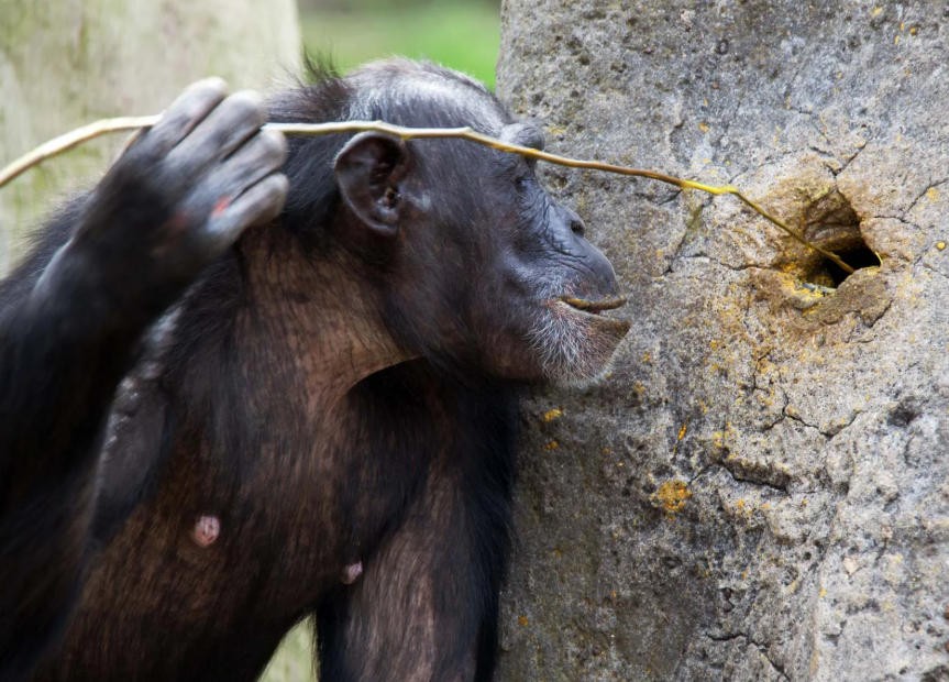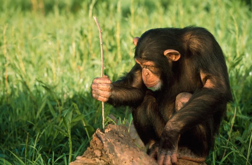 还有,黑猩猩会从树上掰下树枝,去掉上面的树叶,让树枝变得更实用,这相当于对物体进行改造,是工具制造的雏形。
