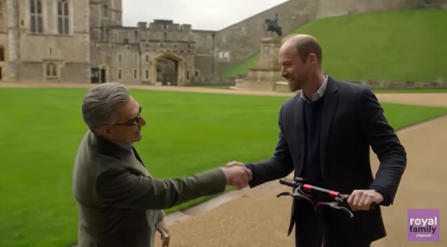这场采访是在轻松的氛围中进行的,威廉骑着一辆电动滑板车来跟尤金见面,他说因为自己总迟到,希望这样能准时赶上约定的时间。