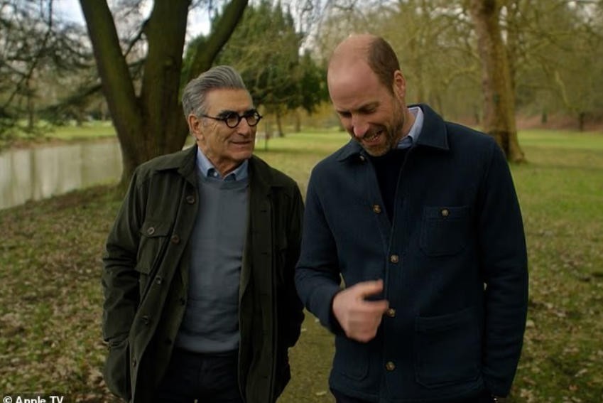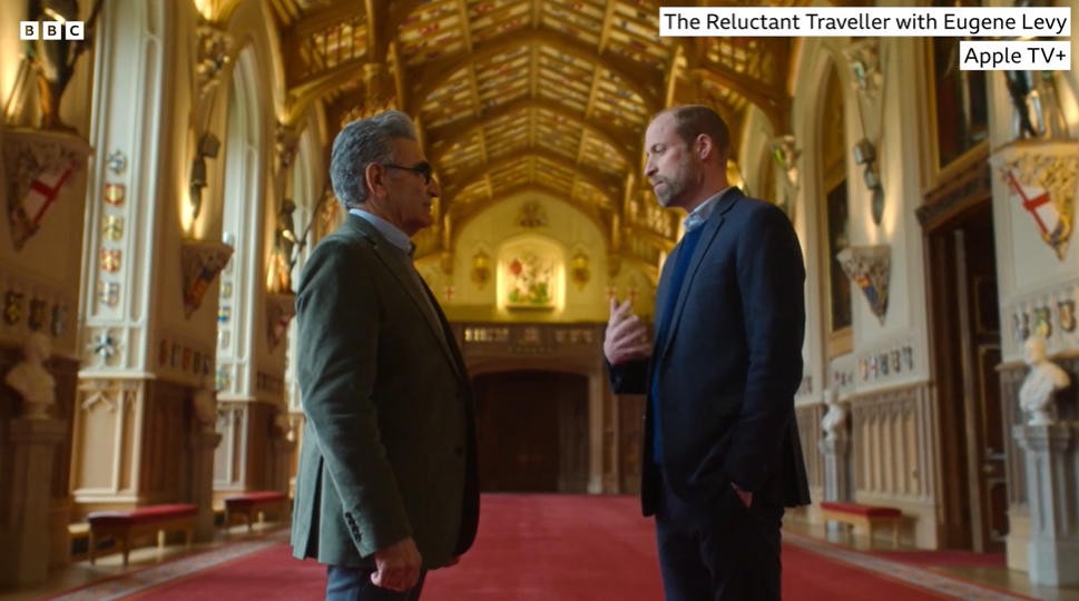 威廉当导游,带着尤金参观了城堡,他们一边遛狗一边聊天,之后还去温莎堡附近的一个酒吧喝了一杯。