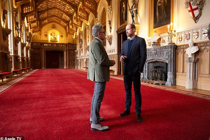 在温莎堡的国王会客厅,威廉还回忆了他的祖父母,也就是已故的伊丽莎白二世女王和菲利普亲王。