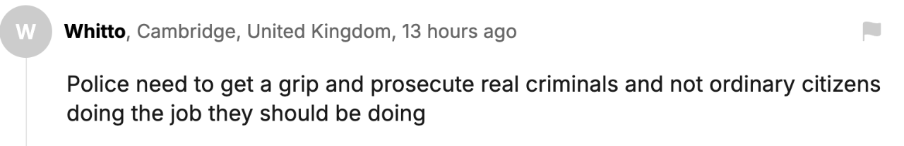 “警察们干点事吧,去起诉真正的罪犯,而不是那些替他们把工作干了的普通市民”。