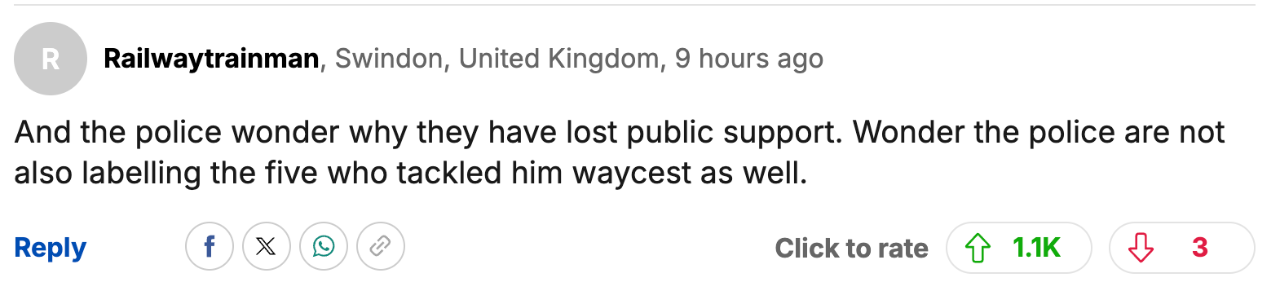 根据英国交通警察的说辞,尽管能理解乘客的惊恐和不安,但他们认为对该男子使用的暴力是不必要且不可被接受的!