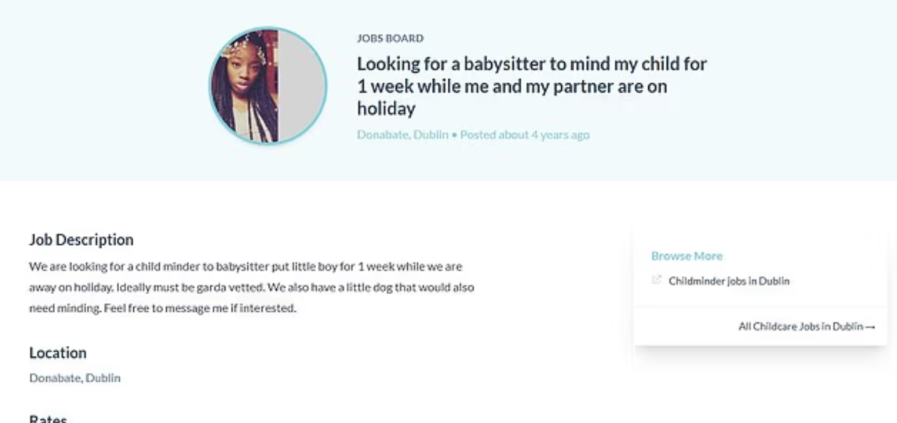 就在Maria夫妻声称Daniel去世的同年,Maria在爱尔兰的育儿求职网站上招聘保姆,在他们休假的时候来照顾Daniel和家里的一只狗狗。