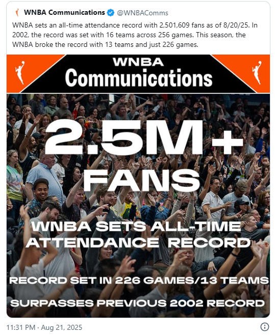 然而过去几年内,WNBA突然好了起来。今年夏天,WNBA的观赛人数迅速来到了250万人,创下了历史记录,球赛门票价格也随之水涨船高。